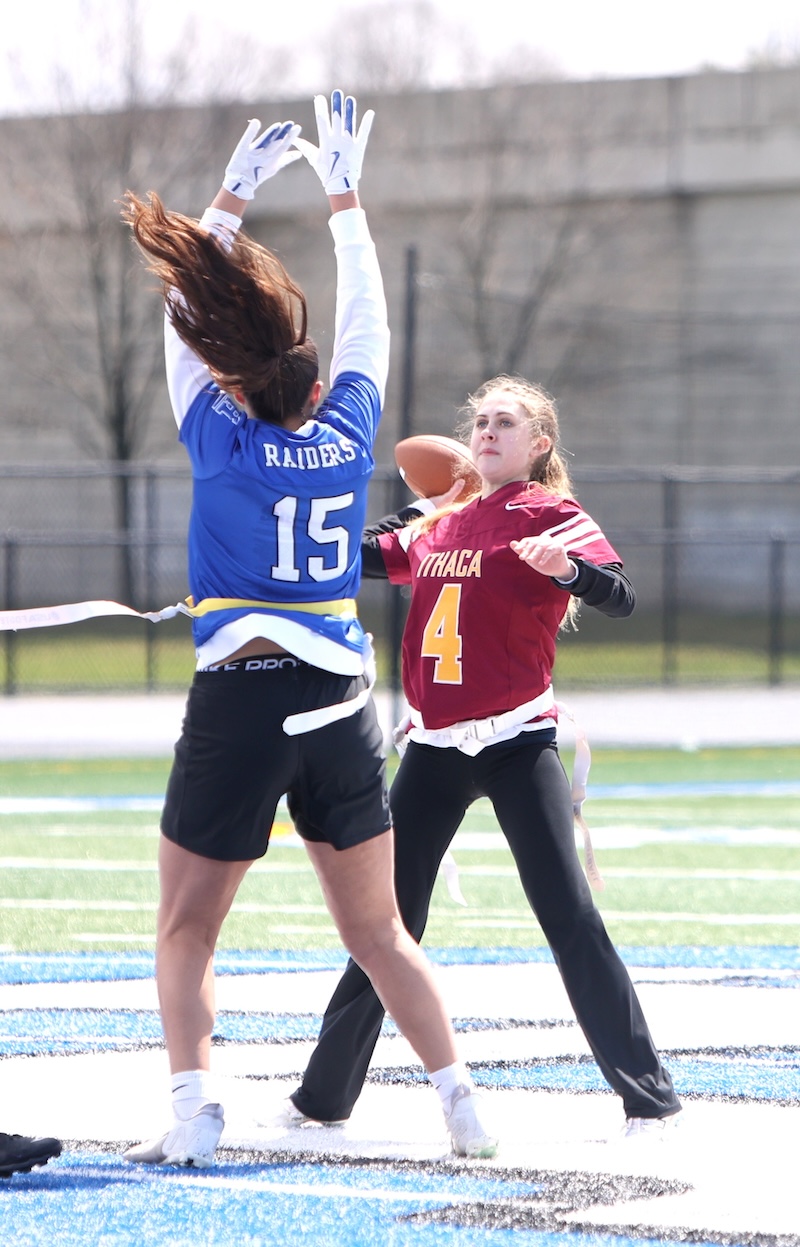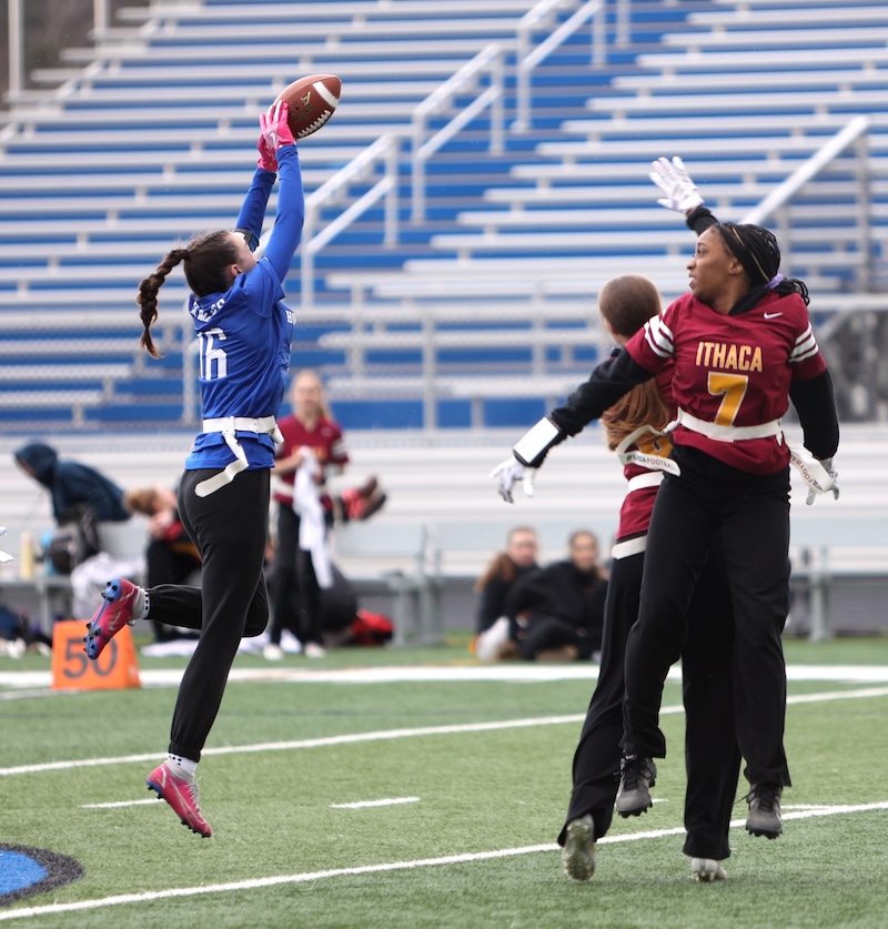Ithaca hit on a big pass play on the final play of the half, but Maggie Sullivan got a flag pull to end the half.