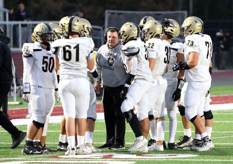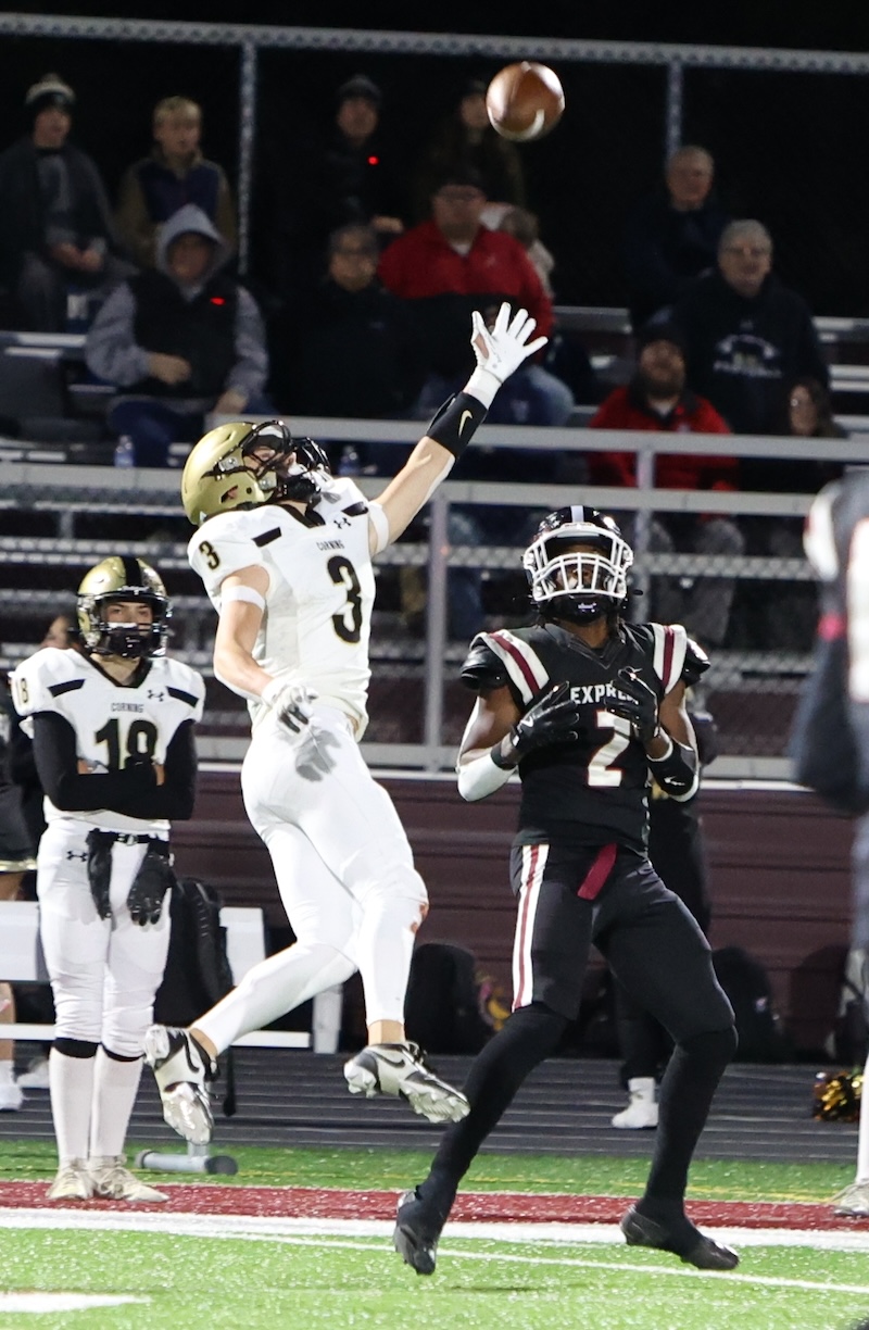 Elmira answered as Daeshuan Harris had a long run down to the one-yard line, then scored on a one-yard run with 6:06 left in the half. Ben Guyette hit the extra point and it was 8-7 Corning.