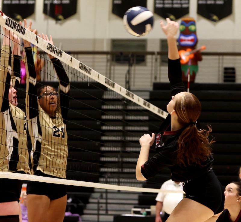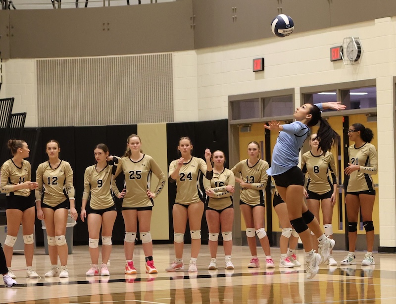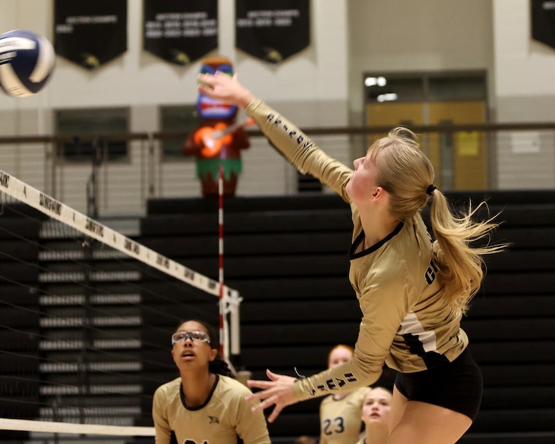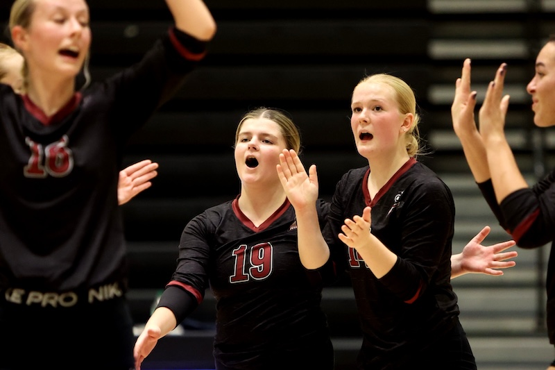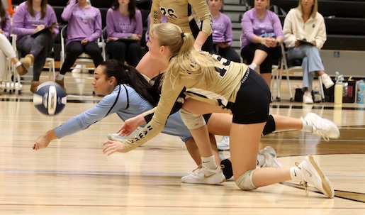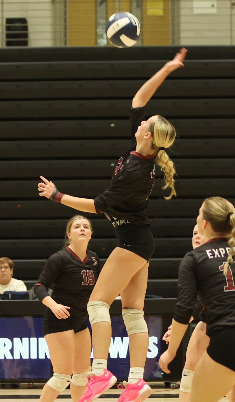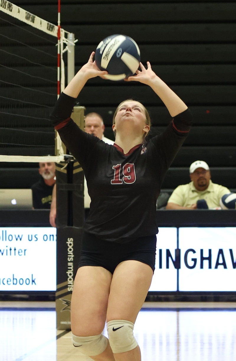 Kylie Leonberger had 10 assists, three serves and a dig and Camille Scoiners had five kills, three blocks, eight serves with three aces and two digs.