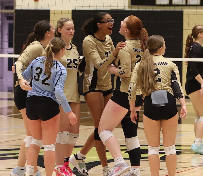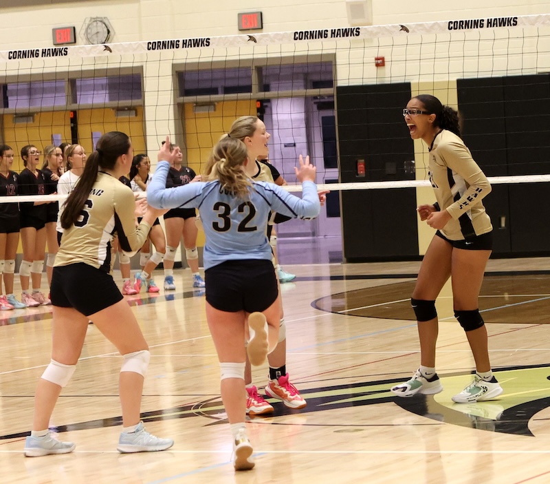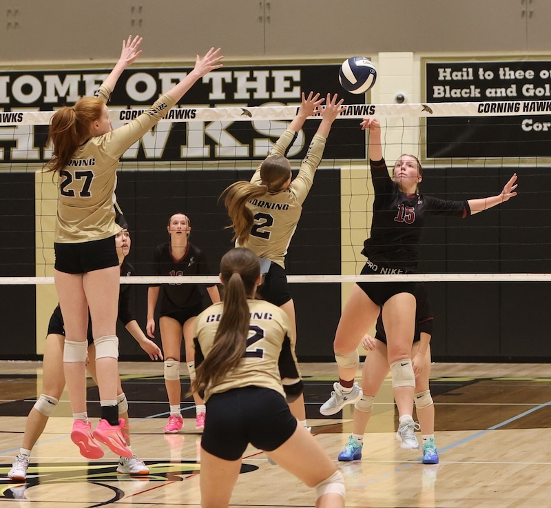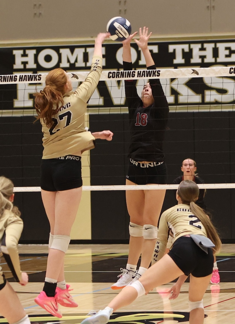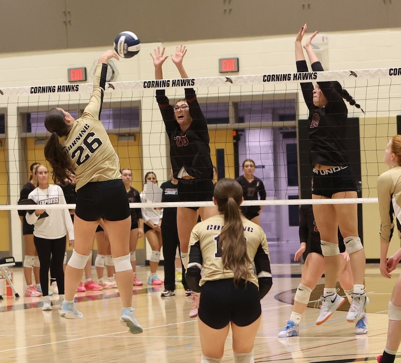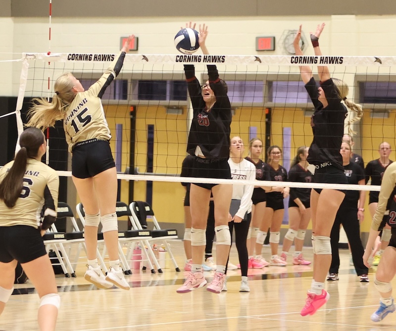 Sam Molingou had eight kills and three blocks for Corning and Char Starns had three points, three aces, seven kills and two blocks.