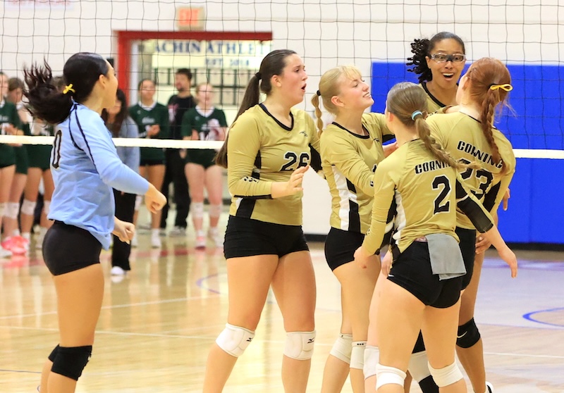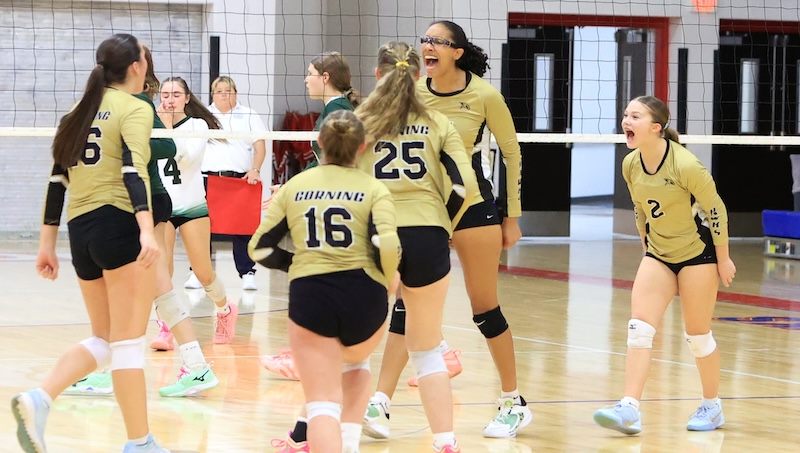 “The first game was great,” Corning coach Barb Smith said. “We came out, put our foot on the gas, we were having fun, smiling. I’m not sure what they were thinking, with them coming back in the second and third and (us) losing. I think it was written on their faces and I tried to tell them you have to have fun again. It was unforced errors on us that I guess did it in for us.”