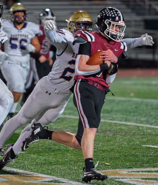 By TIM BIRNEYSouthern Tier Sports ReportVESTAL — Elmira played the two-time defending state champions to a one-score game for 2 1/2 quarters, but Christian Brothers Academy pulled away over the final 18 minutes for a 42-7 win Saturday night in the quarterfinals of the New York State Class AA football playoffs here at Dick Hoover Stadium.