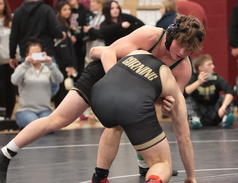 Clayton Smith of Corning won the 175-pound title, pinning Elijah Williams of Newark Valley in 4:00 in the final. Josh Johnson fell 9-0 by major decision to Calbe Kohlback in the third-place match, taking fourth. Braxton Evans of Corning was sixth and teammate Connor VanHome was seventh. Evans fell by technical fall 17-1 in 4:39 to Anthony Enders of Moravia. VanHorne won by fall in 2:52 over Ronin Weston of Marcellus in the seventh-place match.