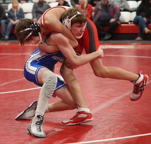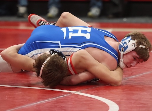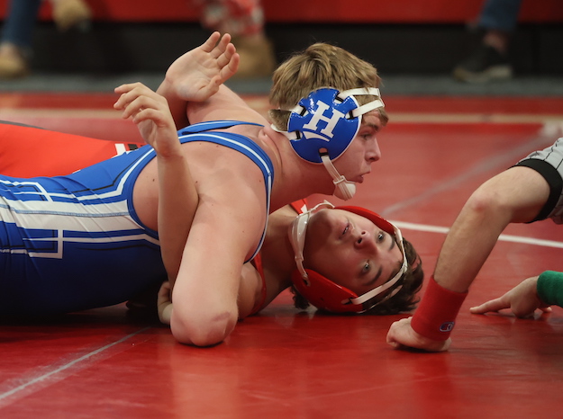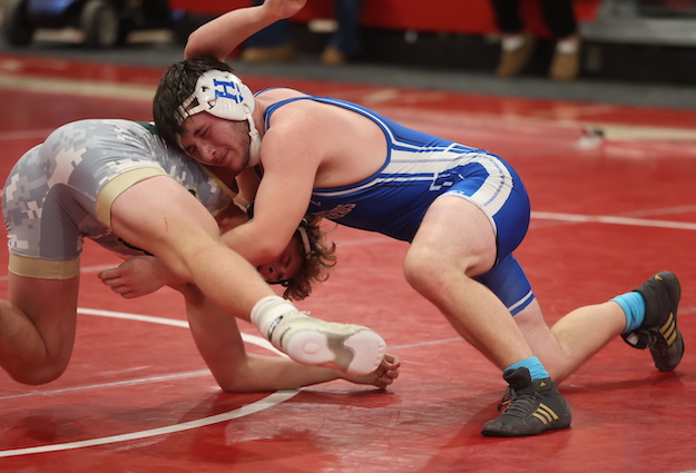 Against Newark Valley at 103 Newark Valley’s Sheldon Houston pinned Trace Woodward in 2:29 and at 110 Nolan Miller of Horseheads won by technical fall 24-6 in 5:46 over Avery Davis.