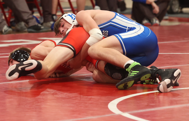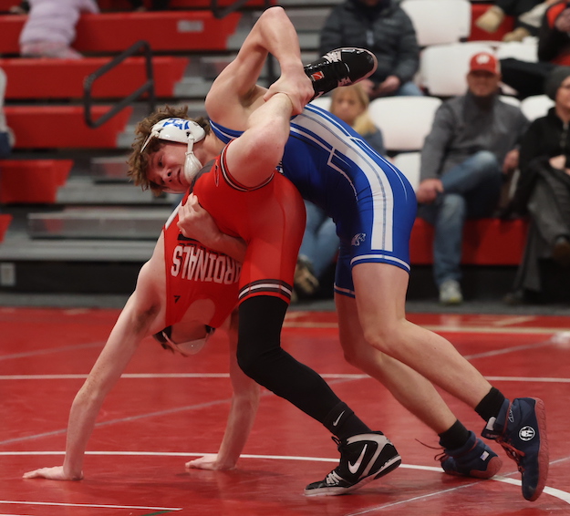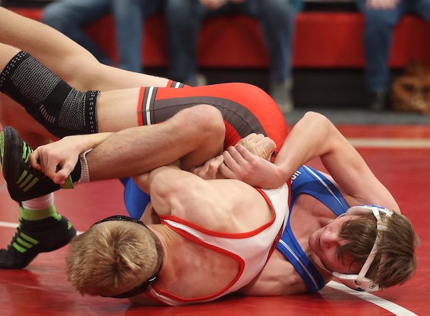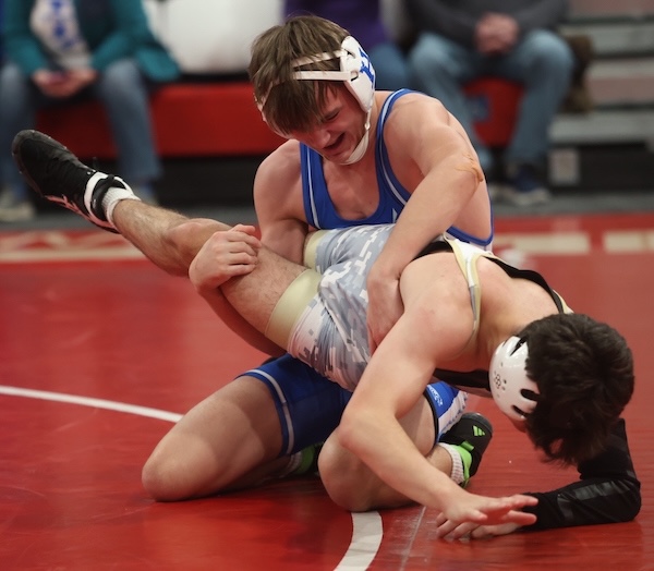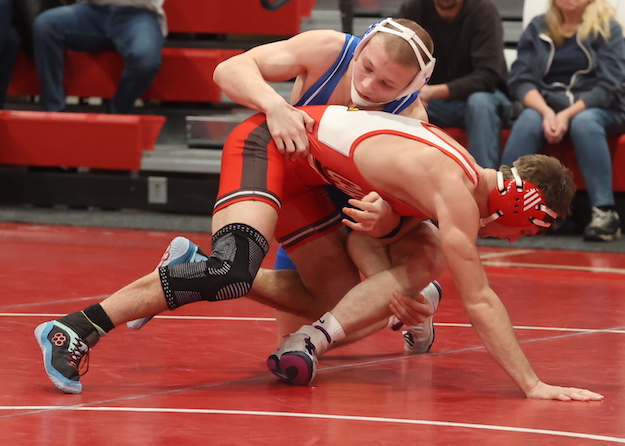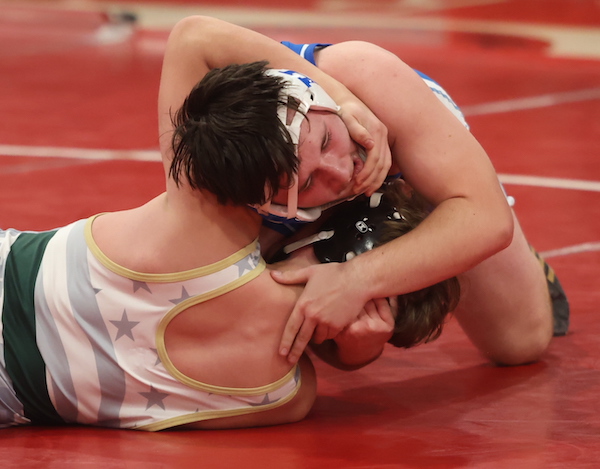 Titus Callahan of Newark Valley pinned Joseph Saks in 1:02 at 190 and Warrick pinned Wyatt Dillow in 3:16 at 215. Jack Blomberg of Newark Valley pinned Allen Reynoso in 3:56 at 285. ———— PHOTOS BY TIM BIRNEY