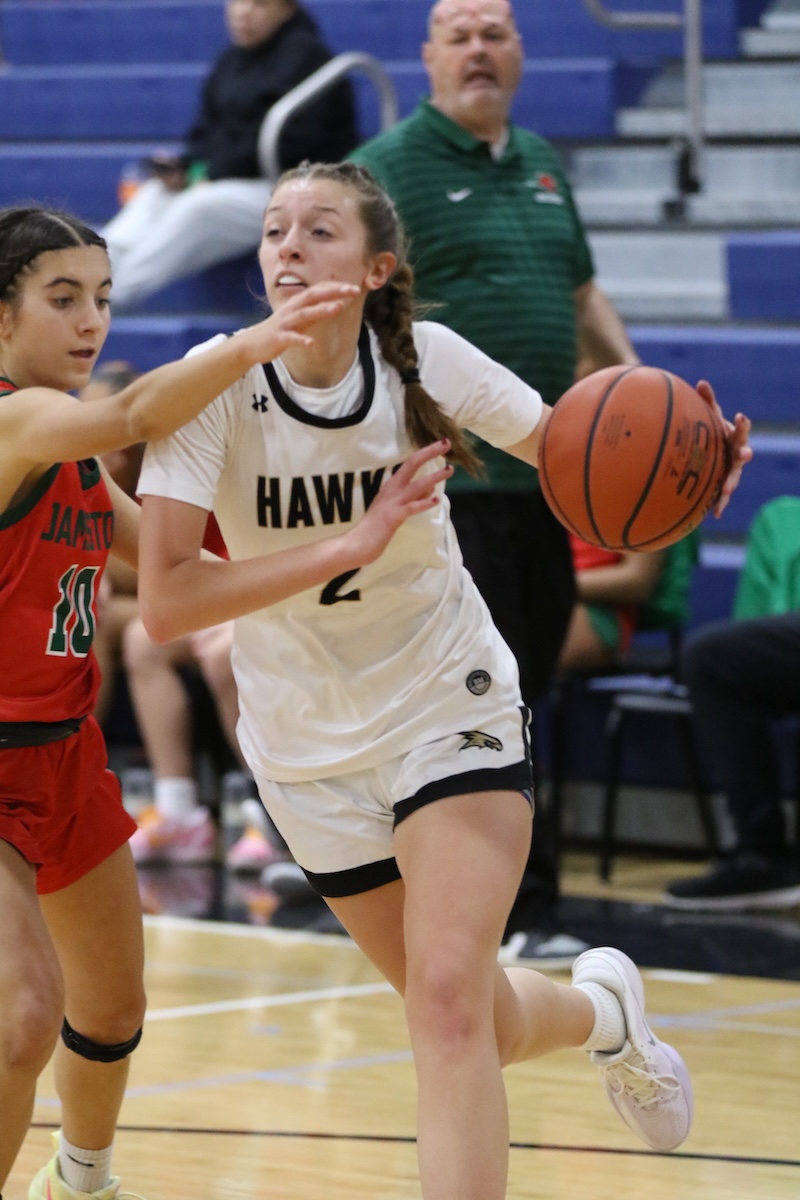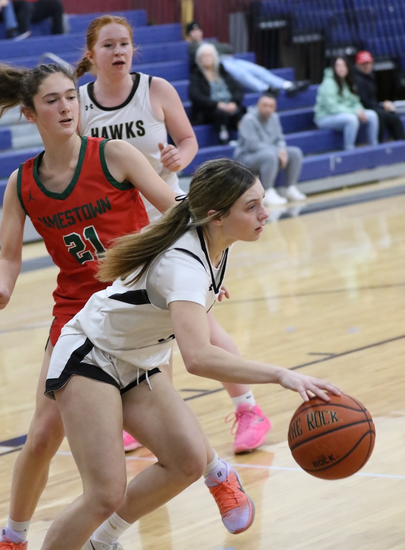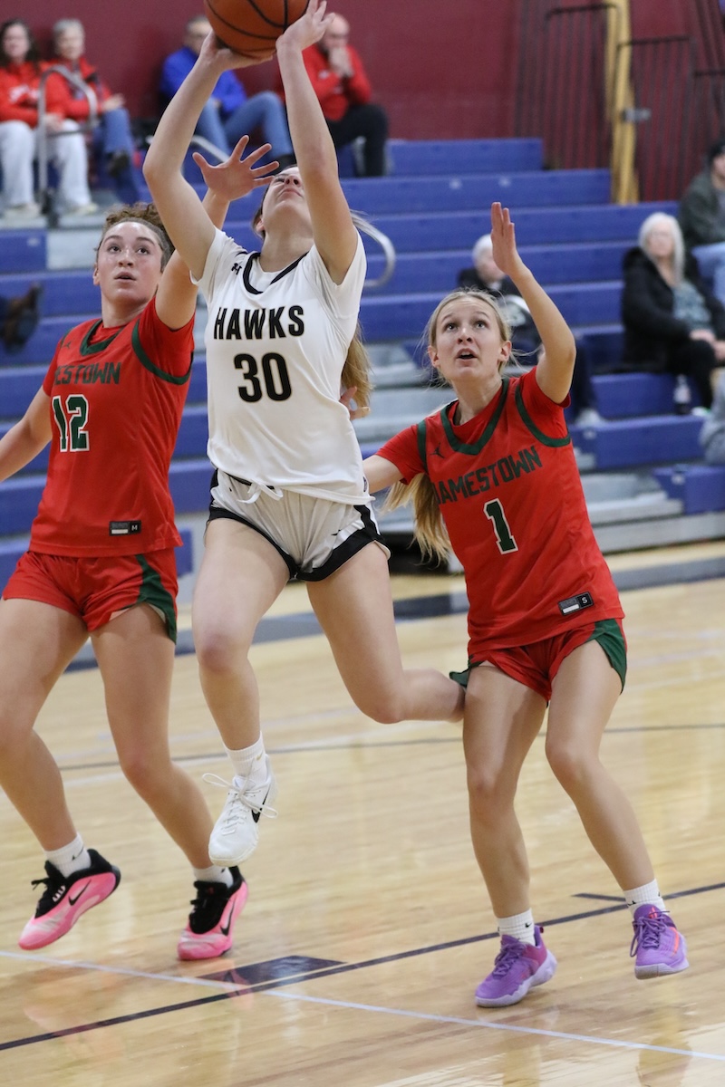 Payton Gibbs led Jamestown with 21 points and Makena Pryce had 13 points. ———— PHOTOS BY SHEILA SUTTON.