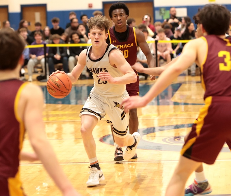 By Brian FeesSouthern Tier Sports ReportWATKINS GLEN — Nolyn Proudfoot and Kyler Stevenson combined for 75 points as the Corning Hawks defeated Ithaca 90-68 to capture the Section IV, Class AAA Championship.