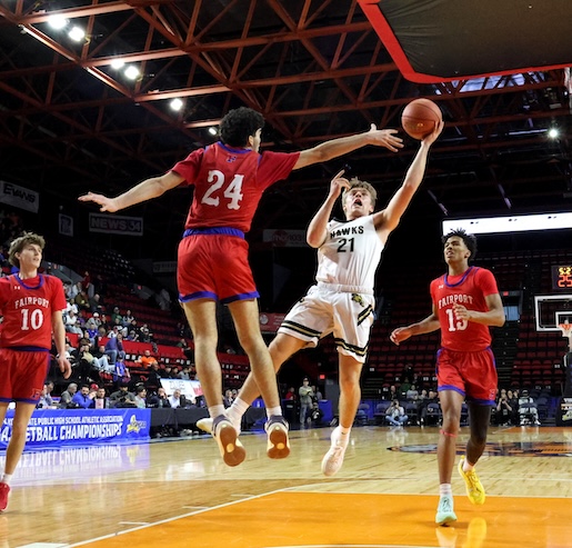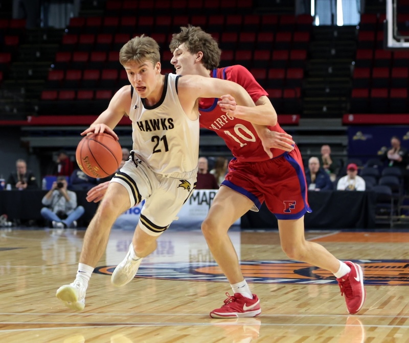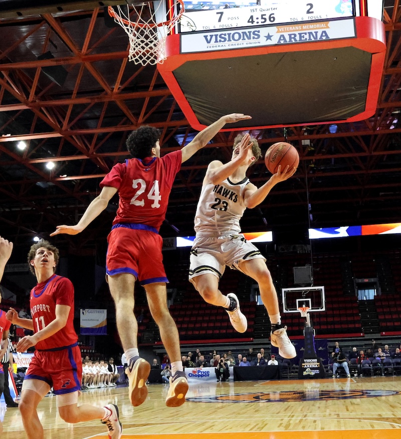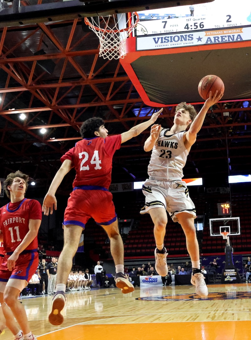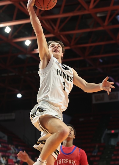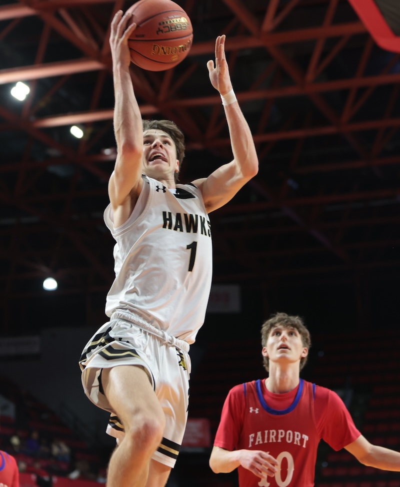 As Fairport turned up the pressure in the second quarter their length made things hard for the Hawks, led by Noah Meabon. The 6-5 volleyball star who is committed to USC and was on the U.S. U19 World Championship team had a pair of big dunks and had a double-double with 13 points and 11 boards.