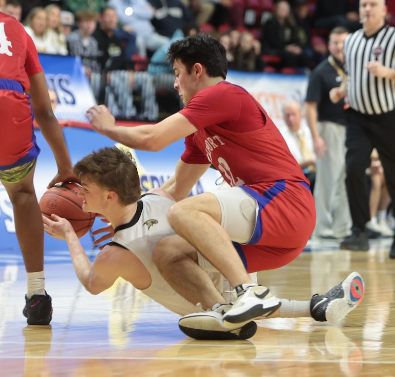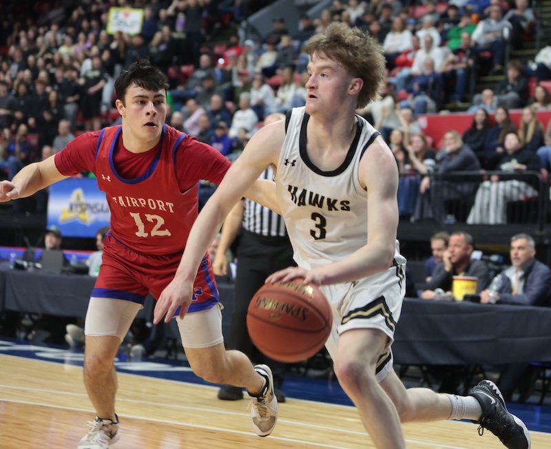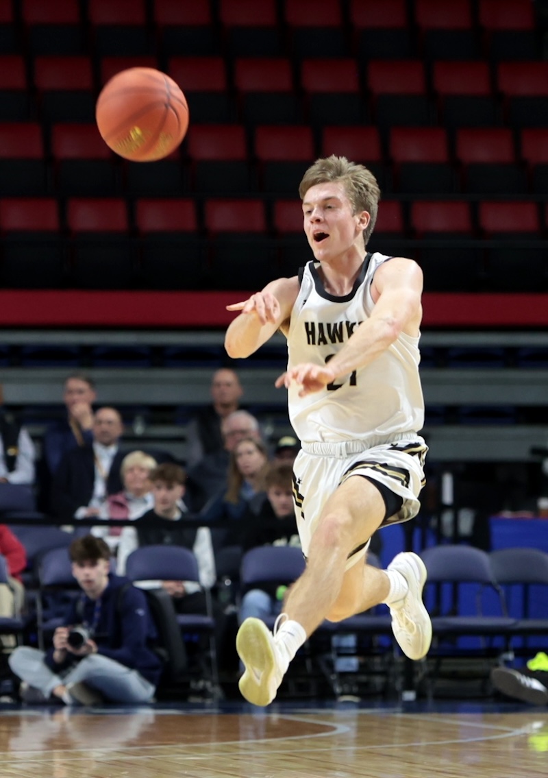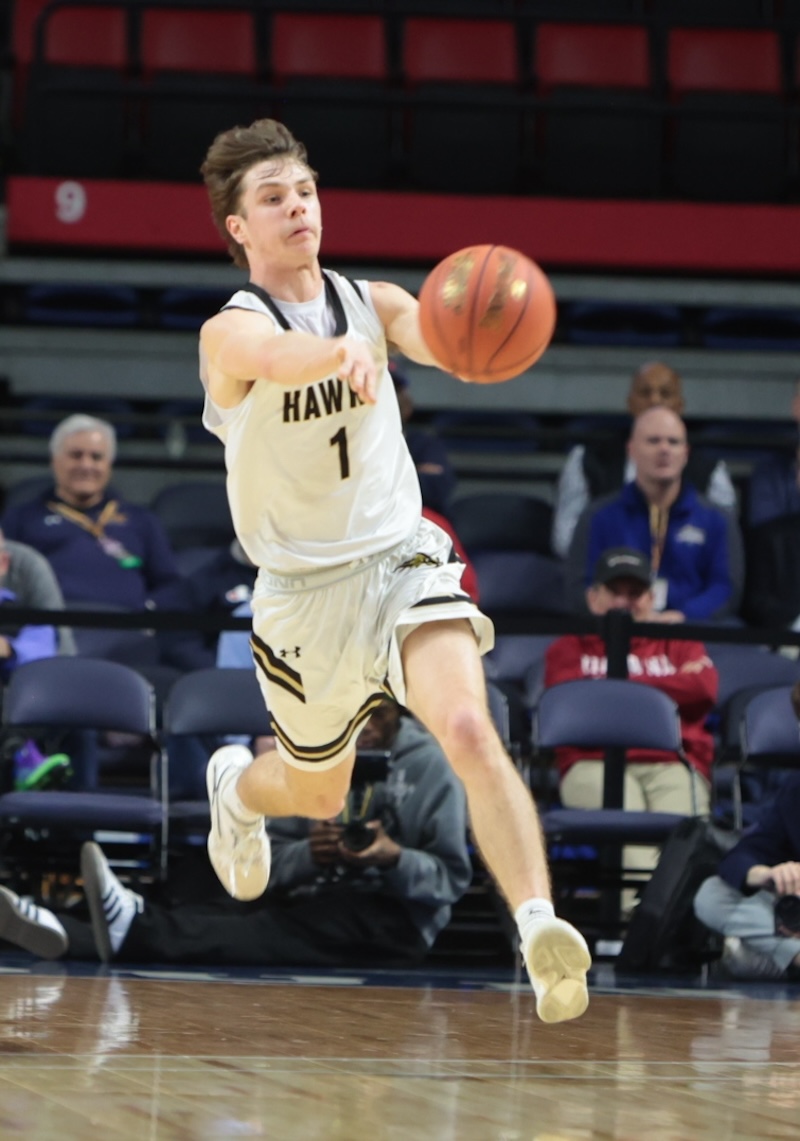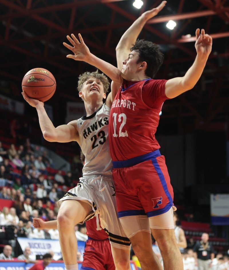 As Fairport turned up the pressure in the second quarter their length made things hard for the Hawks, led by Noah Meabon. The 6-5 volleyball star who is committed to USC and was on the U.S. U19 World Championship team had a pair of big dunks and had a double-double with 13 points and 11 boards.