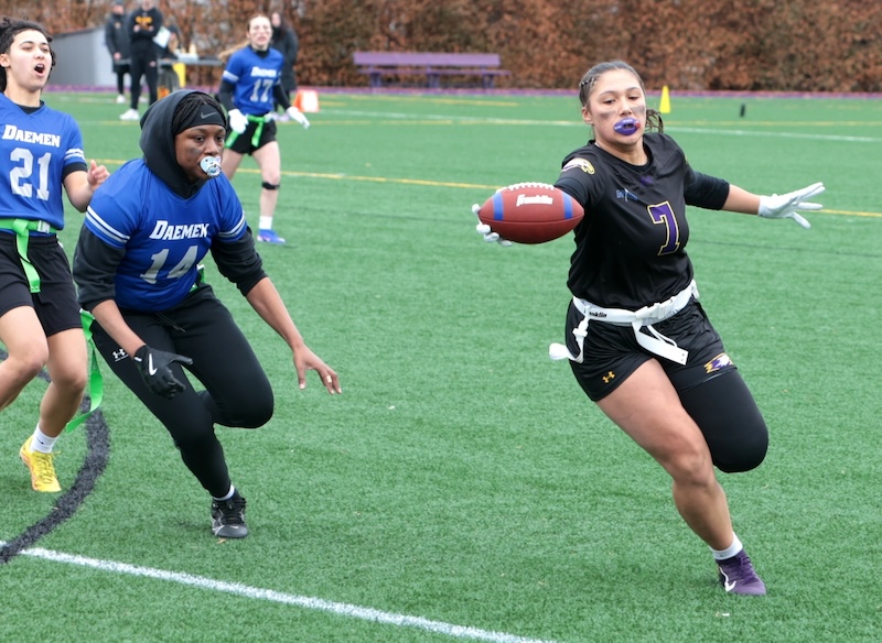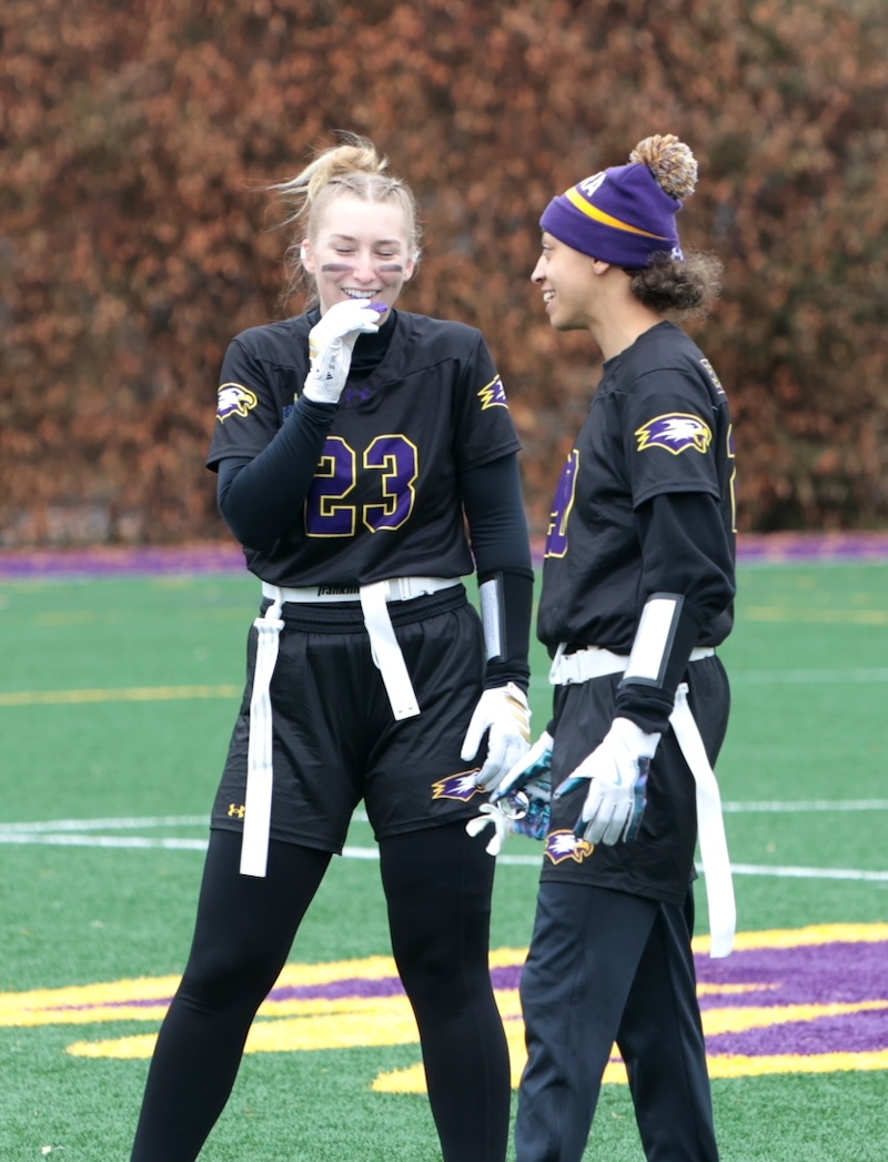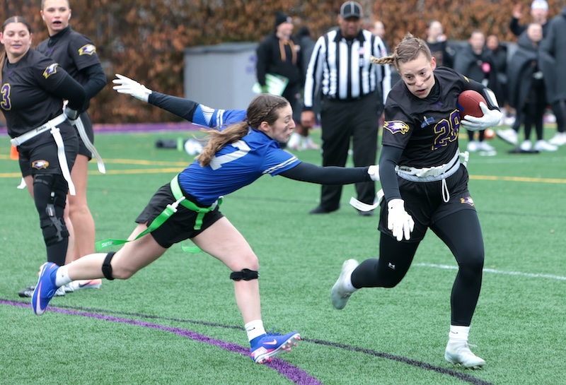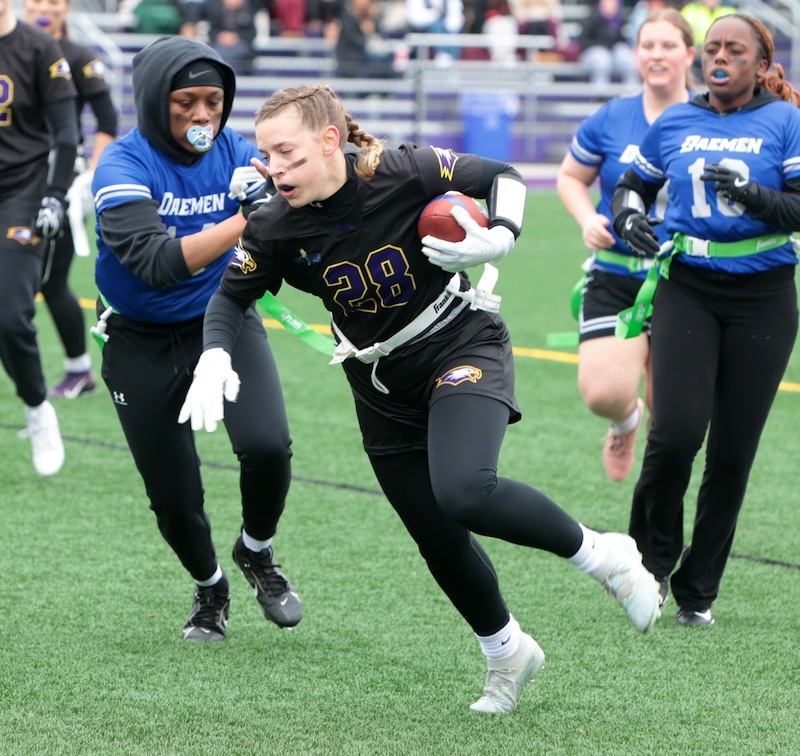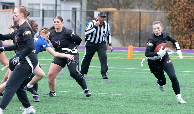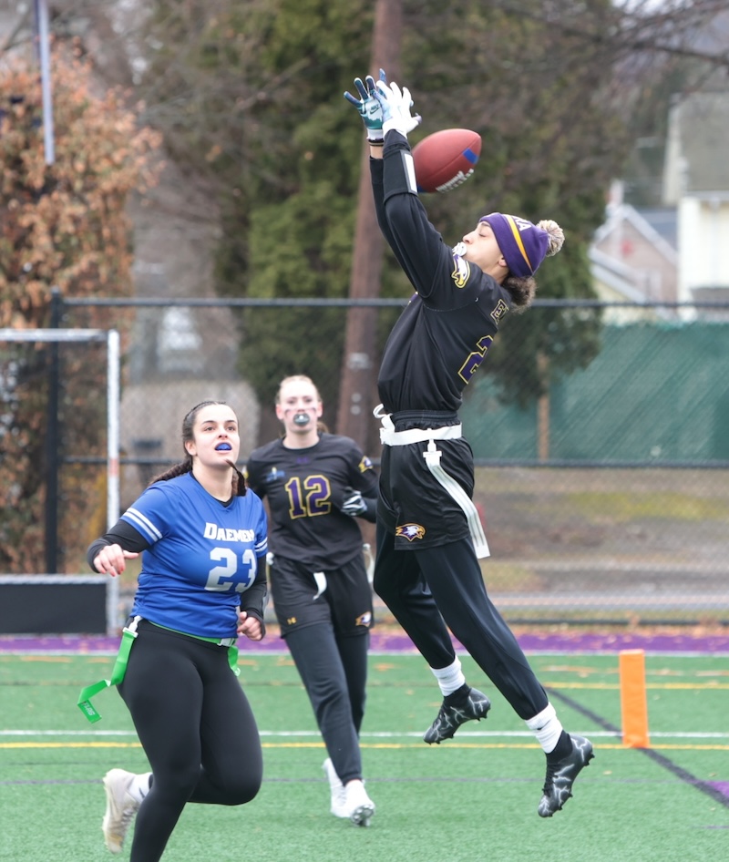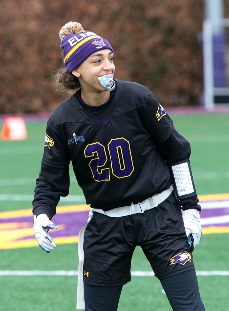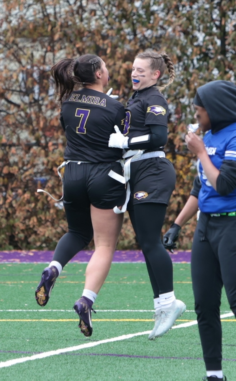 COLLEGE FLAG FOOTBALL: CORNING GRAD SMITH THROWS 7 TD'S, ELMIRA GRAD DIXON HAS 5 INTERCPETIONS AND 3 TD'S AS EC WINS (24 PHOTOS)(March 22, 2026) Southern Tier Sports Report ELMIRA — The Elmira College flag football team moved to 2-0 on the year with a 66-0 win over Daemen on Saturday.